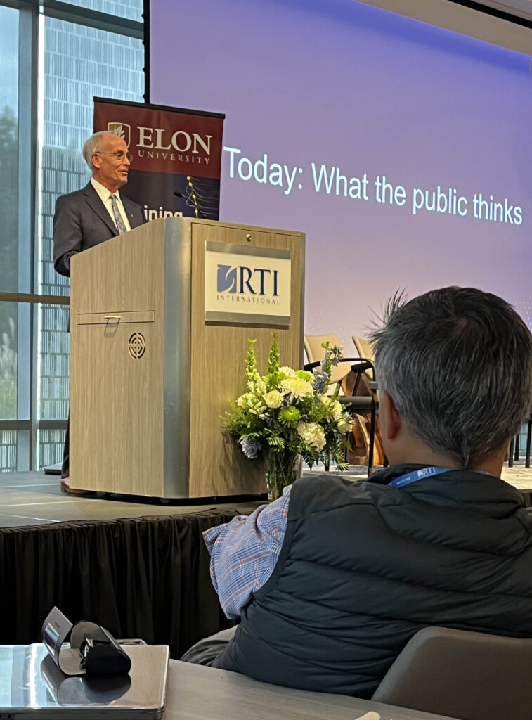 Gabel noted his pride in hosting the summit in partnership with Elon University and outlined some of RTI’s efforts to use artificial intelligences responsibly. Projects include tools for public health communication, a new AI system for RTI researchers, and a “digital twin” of the U.S. population to model disease spread and test solutions.